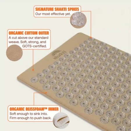 Premium Blissfoam™: Exclusive to the Original Shakti Mat, this 100% organic foam is wrapped in GOTS-certified organic cotton, making it ideal for those with natural rubber sensitivities. Blissfoam™ adapts to your body, molding each spike for next-level tension relief.